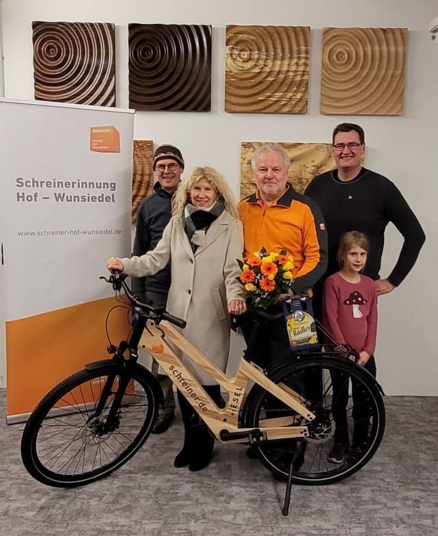 Die glückliche Gewinnerin mit Schreinermeister Roland Schneider bei der Fahrradübergabe. Obermeister Reinhard Schmidt(hinten links) und stv. Obermeister Daniel Raithel(hinten rechts mit Tochter) freuen sich mit.
