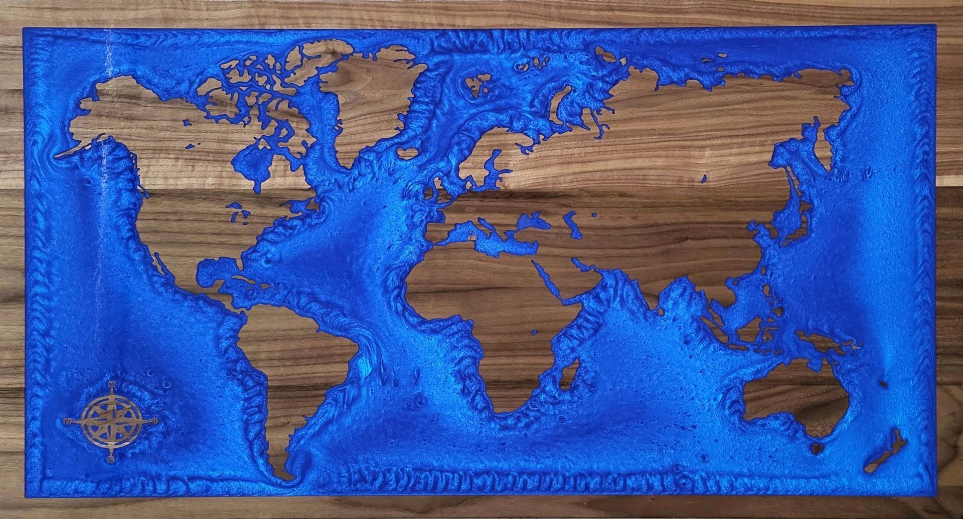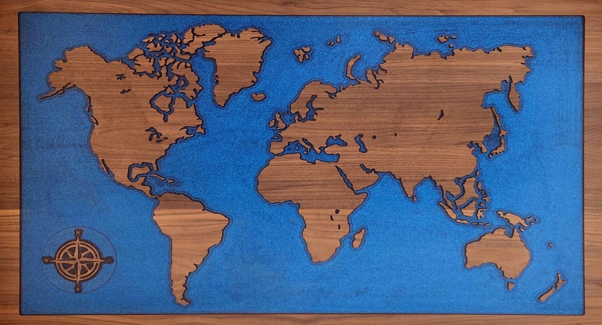 Weltkarte in Nußbaum mit Epoxidharz, Größen bis ca. 98 x 58 x 3 cm
