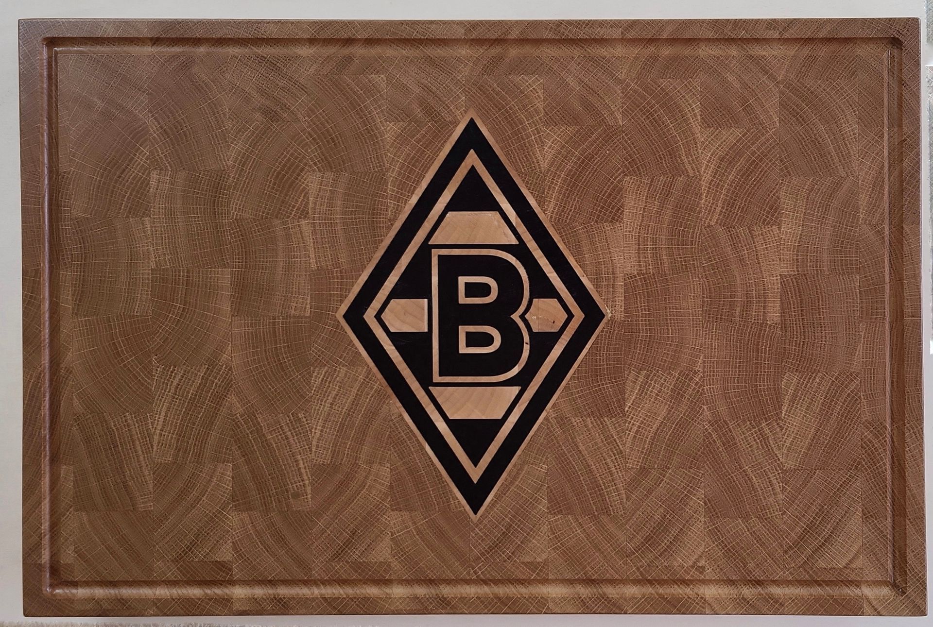 Eiche Massivholz mit eingelegtem Logo in Massivholz.